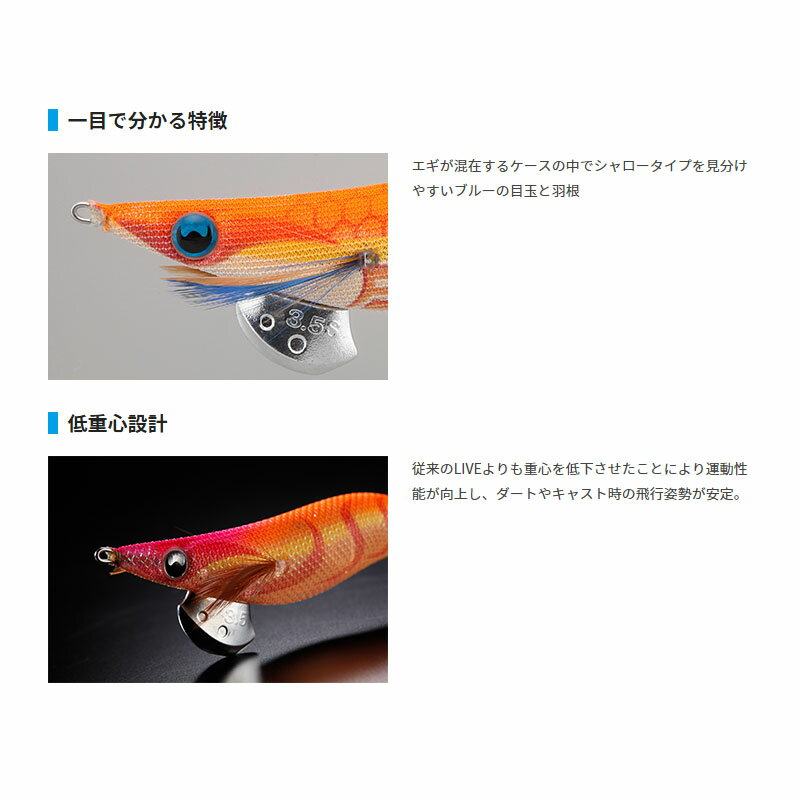 一目で分かる特徴エギが混在するケースの中でシャロータイプを見分けやすいブルーの目玉と羽根低重心設計従来のLIVEよりも重心を低下させたことにより運動性能が向上し、ダートやキャスト時の飛行姿勢が安定。